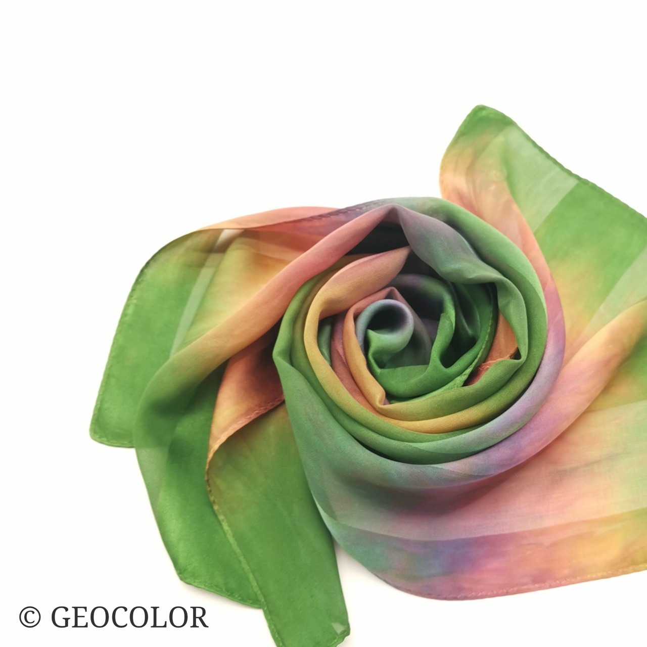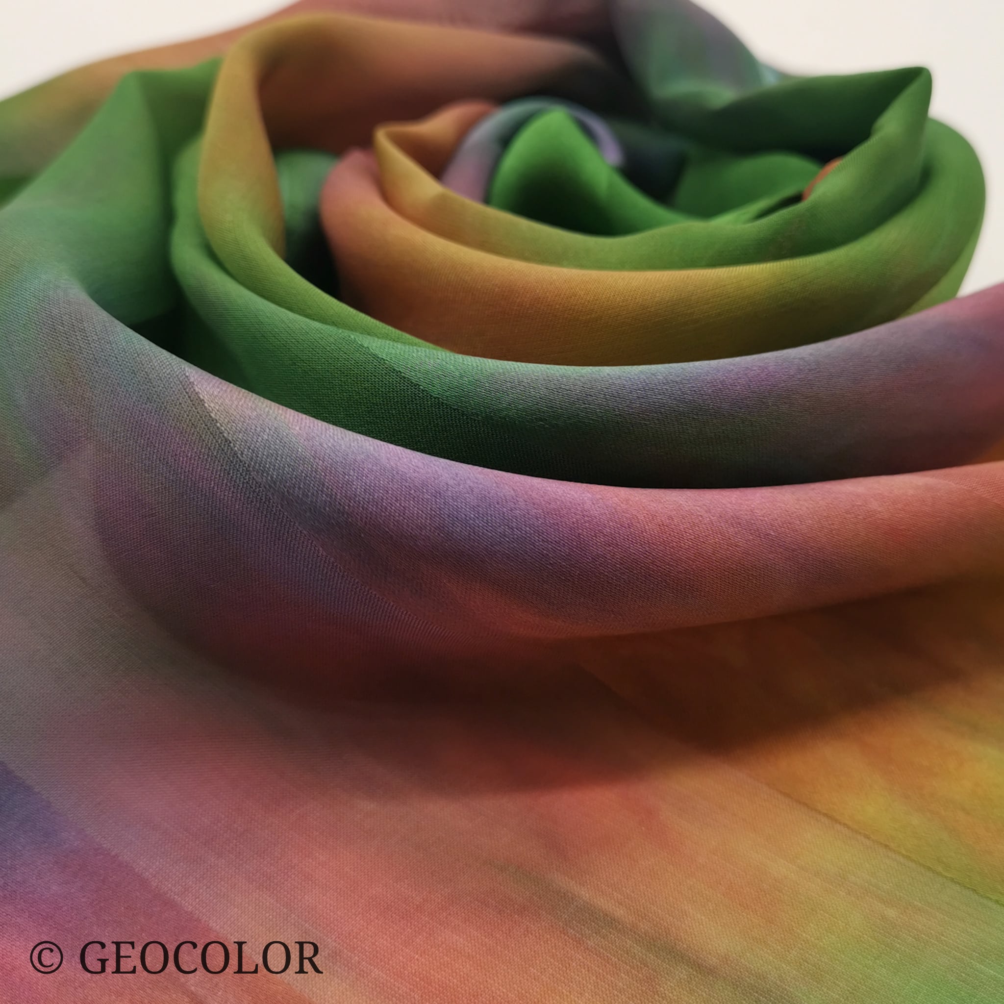 八幡平地熱蒸気染色の多彩なグラデーションが特徴のシルクロングスカーフです。
